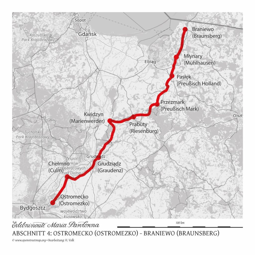 Der Abschnitt 4 der Erlebnisroute Maria Pawlowna umfasst eine Strecke von Ostromecko nach Braniewo mit einer Entfernung von ca. 220 km. Die Reisegesellschaft Maria Pawlownas fuhr am 26. Oktober 1804 von Braunsberg ab und kam am 28. Oktober 1804 in Ostromezko gegen vier Uhr am Nachmittag an.