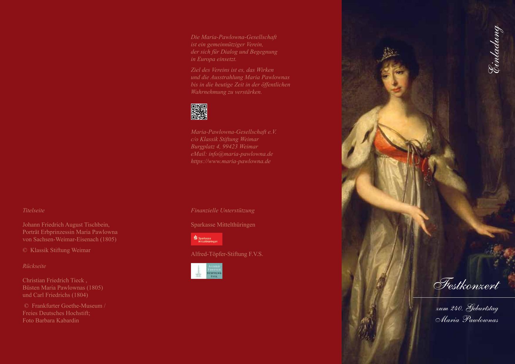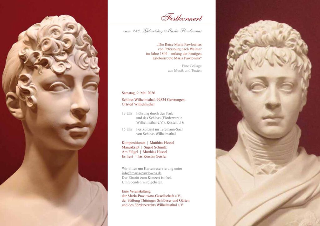 den 240. Geburtstag von Maria Pawlowna in diesem Jahr möchte unser Verein mit einem Festkonzert im Schloss Wilhelmsthal bei Eisenach, der Lieblingssommerresidenz Maria Pawlownas, würdigen.